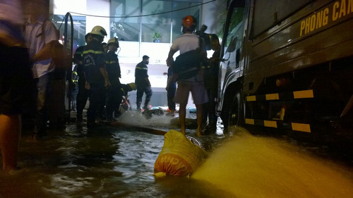 | Lực lượng chức năng tích cực bơm nước ra ngoài Ghi nhận tại hiện trường vào khoảng 8h tối ngày 6/9, nước từ cơn mưa lớn trước đó đã gây nên tình trạng ngập nặng trong tầng hầm để xe rộng khoảng 500m2, thuộc khách sạn Sài Gòn View Residences, địa chỉ số 117 đường Nguyễn Cửu Vân (Q.Bình Thạnh). Vào thời điểm này, bên trong căn hầm hiện có rất nhiều xe máy và ô tô đang đỗ, mực nước cao che mất cả biển kiểm soát. Nhiều xe ô tô ngập trong bể nước sâu hơn 1m Sau khi nhận được tin báo, hàng chục cán bộ chiến sĩ thuộc lực lượng cứu hộ & cứu nạn, phòng Cảnh sát PCCC Q. Bình Thạnh đã có mặt để hỗ trợ bơm nước ra ngoài, giảm thiểu thiệt hại về tài sản. Được biết, khách sạn Sài Gòn View Residences có tổng cộng 93 phòng, trong đó hầu hết khách là người nước ngoài. Cũng trong cơn mưa lớn nói trên, một cây cổ thụ cao khoảng 20m với đường kính hơn 1m đã bất ngờ tróc gốc ngay bên hông Thảo Cầm Viên, đường Nguyễn Thị Minh Khai (Q.1, TP HCM). Cây ngã kéo theo một mảng lớn gạch lót lề đường bị xới tung, một trụ bê tông cùng nhiều mét hàng rào sắt của Thảo Cầm Viên bị đè sập hoàn toàn. Cây cổ thụ đường kính hơn 1m đè sập trụ bê tông và nhiều mét hàng rào sắt Theo số liệu thống kê, cơn mưa chiều ngày 6/9 với lượng nước ước tính vào khoảng 122mm là cơn mưa lớn nhất đổ xuống khu vực TP HCM tính từ đầu năm 2014 đến nay. Đặng Minh |